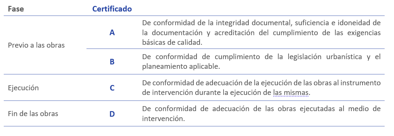 ECUV EQA puede intervenir en los procedimientos relativos a las actuaciones urbanísticas previstas en los artículos 232 y 233 del Texto Refundido de la Ley de Ordenación del Territorio, Urbanismo y Paisaje, de la Comunitat Valenciana aprobado por el Decreto Legislativo 1/2021. Cada tipo de actuación requiere unos tipos de certificados: